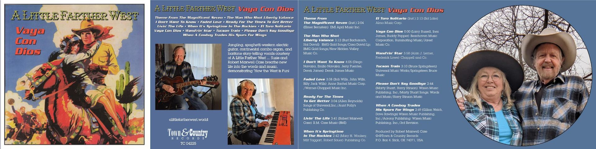 Oklahoma's A Little Farther West is a musical duo comprised of Robert Maxwell Case on electric guitar and vocals and his wife Susie Case on continental combo organ. The group's sound evokes the spirit of classic Western movie soundtracks, presenting a modern take on the cinematic instrumental and vocal styles of the mid-twentieth century.